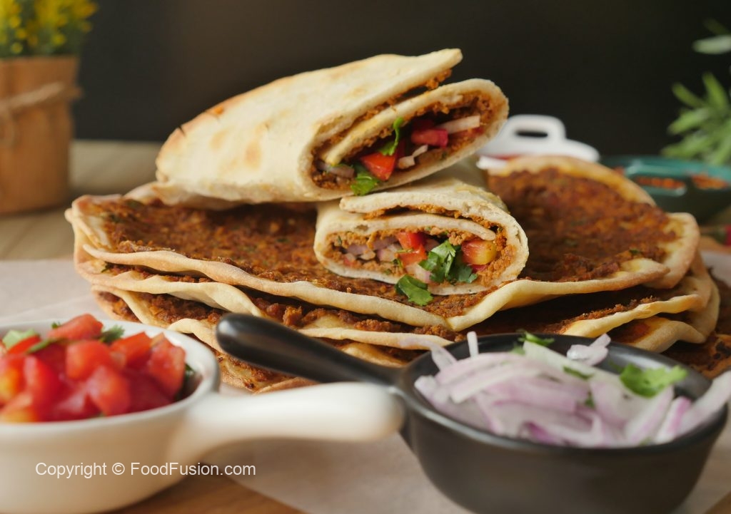 Lahmacun ko pyaz,tamatar,hara dhania aur lal mirch crushed ka saath serve karein!