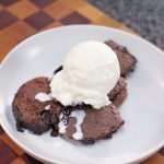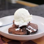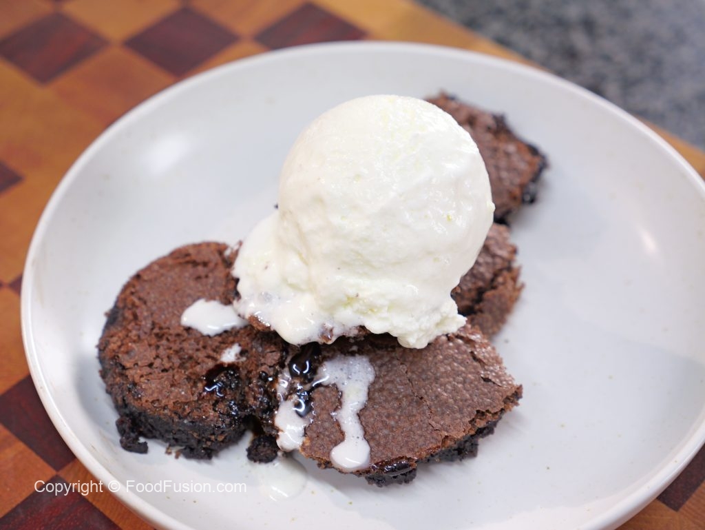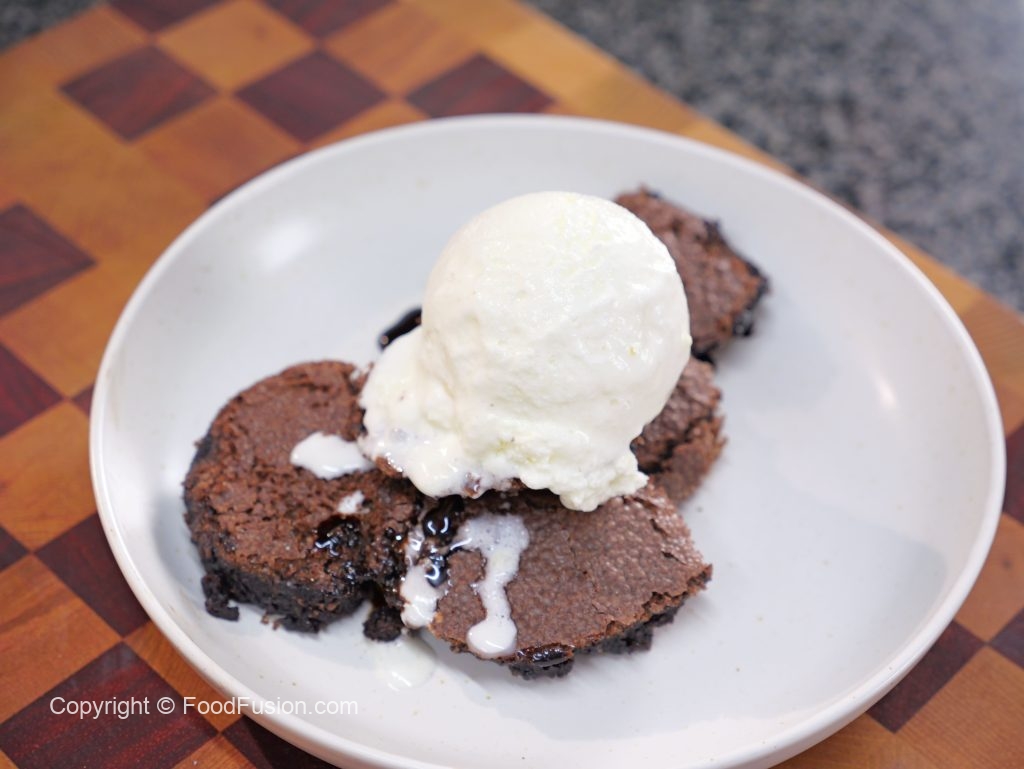 -Take it out of the oven & let it cool for 15 -20 minutes, scoop out the brownie pudding & add it to a serving plate, serve with ice-cream.