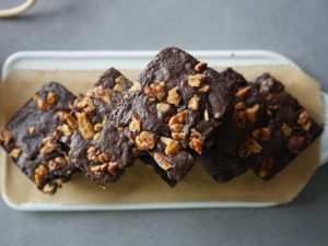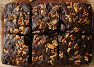 Pour brownie batter in prepared baking dish and add reserved cooking chocolate chunks (100g) & walnuts.