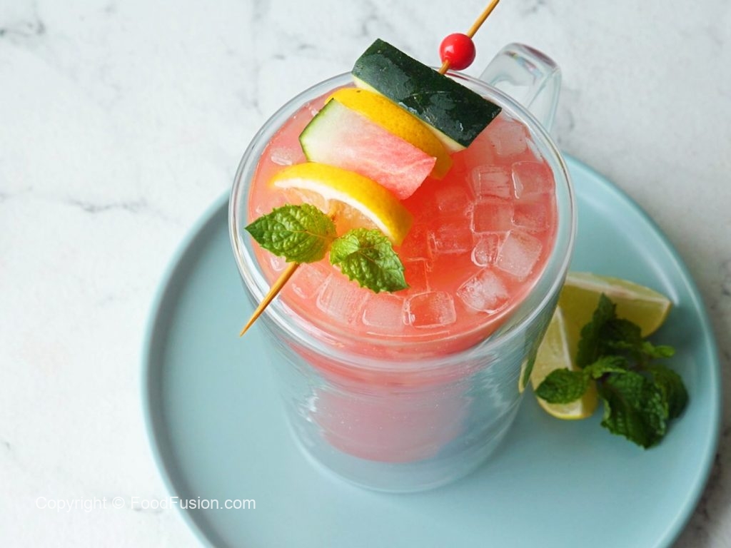 Blender mein watermelon,kheera,lemon juice,shahad aur lemon green tea dal ker ache tarhan blend karein & strain ker lein.