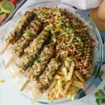 In a serving dish,add boiled rice,add & spread prepared tarka,add prepared vegetables,chicken skewers and potato fries.