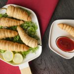 Grease baking tray with oil,place wrapped green chilies and applying egg wash.