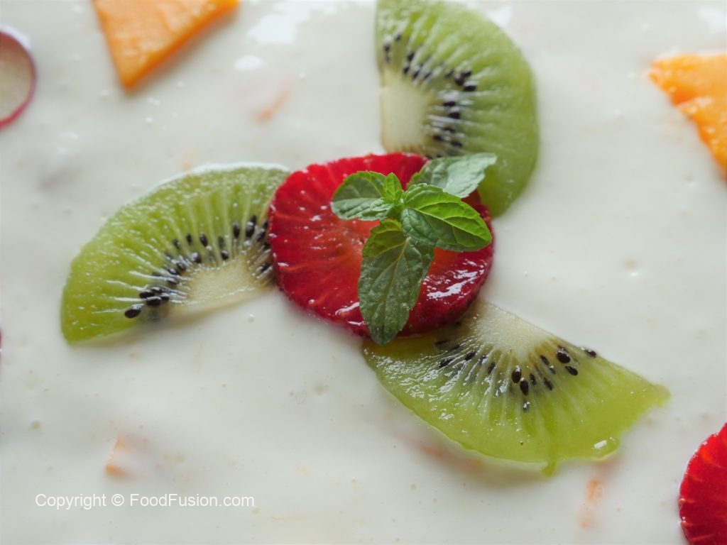 Serving dish mein banana,aam,strawberries,kiwi aur tayyar yogurt fruits dal ker serve karein.